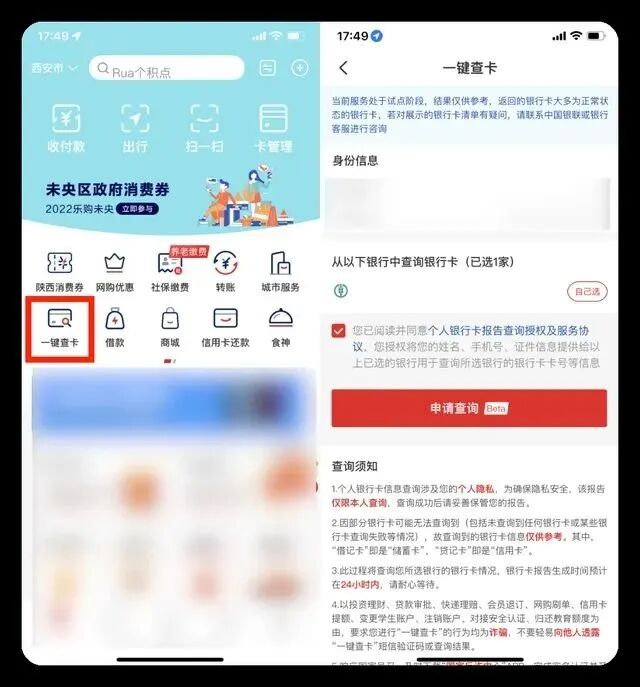 可以在云闪付APP中搜索“一证查卡”进入APP。通过这款软件,居民能很方便地查询本人名下电话卡、银行卡数量,防止居民因为信息不对称落入诈骗分子的圈套。